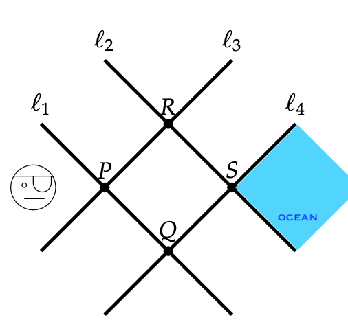 What are all the ways to reflect the pirate face along lines l1, l2, l3, l4 so the pirate lands in the ocean (the shaded region below)? Which ways would you classify as equivalent? Inequivalent? Why?